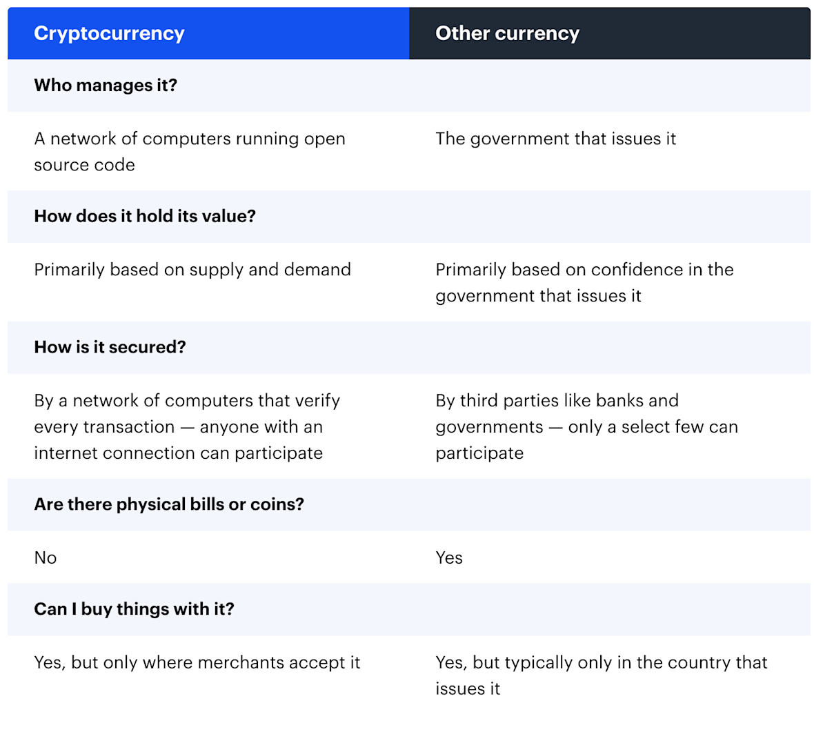 加密货币和传统货币有一些共同特点,比如可以用它们购买东西,或者可以通过电子方式进行转账,但它们也有一些有趣的不同之处。以下是其中一些重点。